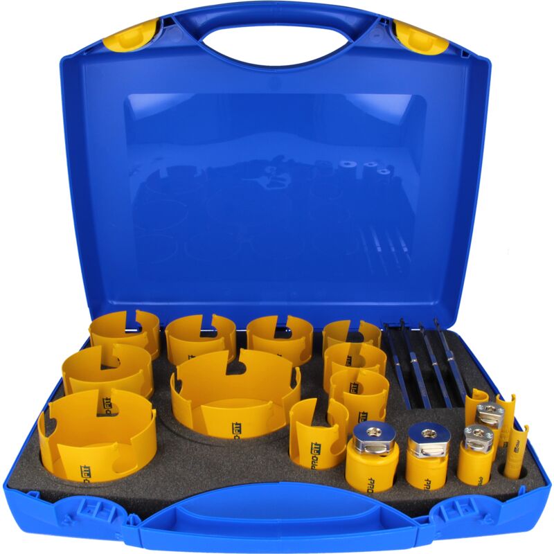 Set di seghe a tazza Multi Purpose mm. 16-19-22-25-29-35-44-51-56-64-68-73-76-82-92-102-127 mm Questa fresa con denti in metallo duro e adattatore integrato Click & Drill® è fornita completa di punta di centraggio. Per utilizzo nel legno, panelli truciolari e MDF e materiali abrasivi, come mattoni, cartongesso calcestruzzo poroso. Punta di centraggio anche in versione Heavy Duty e con attacco SDS. Compreso: 1 attacco MP 16-30 Wood 1 attacco MP 32-330 Wood 1 attacco MP 16-30 Stone 1 attacco MP 32-330 Stone In valigia plastica. Confezioni di imballo: 1
