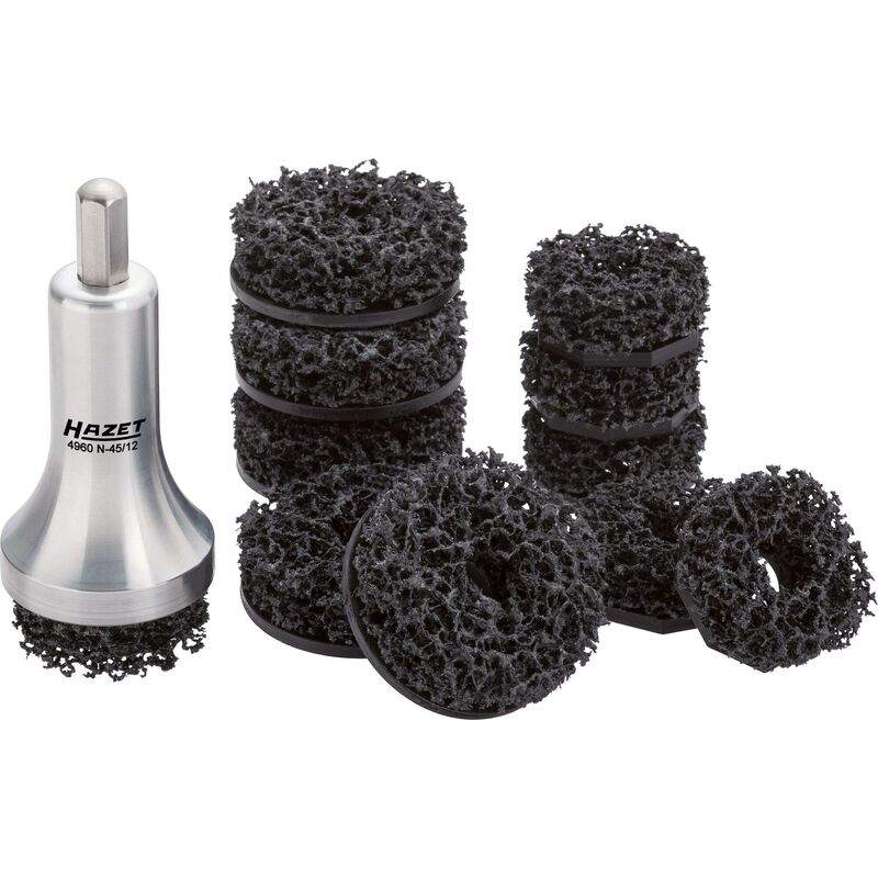 Applicazione: Pulizia facile e veloce della superficie di contatto da ruggine e sporco sui mozzi ruota e sui dischi dei freni con supporto viti ruota Platorello in alluminio con profilo ottagonale per un alloggiamento sicuro e saldo dei dischi abrasivi Alloggiamento ad es. su trapani ad aria compressa, a batteria e collegati in rete Alloggiamento esagonale per un fissaggio saldo nel dispositivo Profilo ottagonale per un alloggiamento sicuro e saldo del disco abrasivo sul corpo Per mozzi di ruote con prigionieri (zona abrasiva 40 o 50 mm di diametro. Prigionieri con lunghezza massima 55 mm), ad es. FORD ∙ PORSCHE ∙ Volvo, autovetture giapponesi Resistente all'usura: circa 50 veicoli per disco Serie di 12 pezzi, contenuto: 1 corpo in alluminio 6 dischi abrasivi con 50 mm di diametro 5 dischi abrasivi con 40 mm di diametro Il materiale abrasivo a «pori aperti» e la forma a campana del platorello riducono al minimo la formazione di polvere Non provoca scintille Made in Germany Peso netto