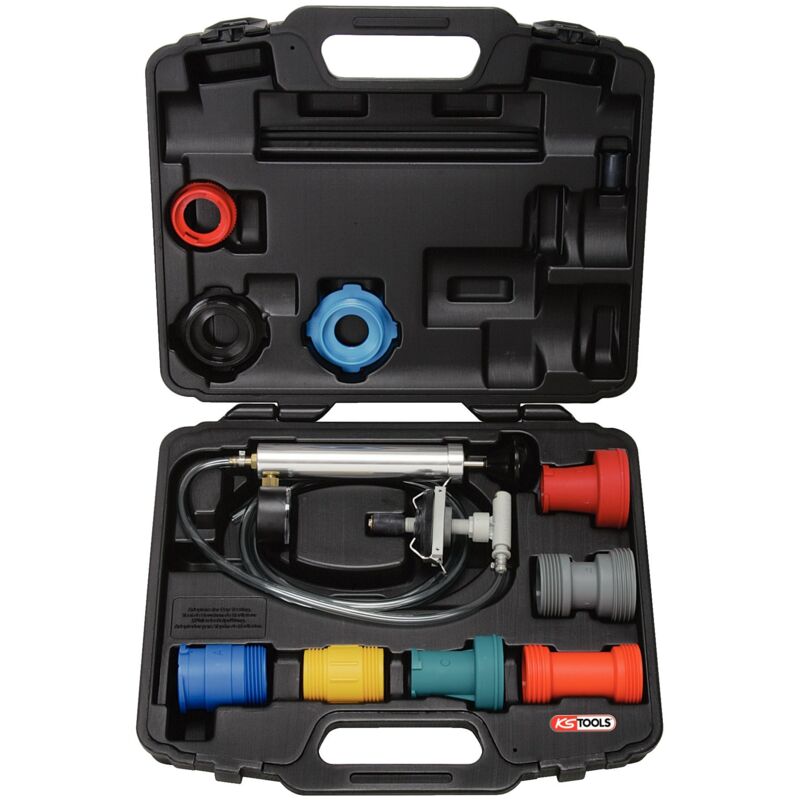 Apparecchio universale innovativo per il controllo della pressione dell'impianto di raffreddamento e dei bocchettoni del radiatore Adatto a pressoché tutti i veicoli con motori a raffreddamento ad acqua grazie al sistema con guarnizione gonfiabile Cappucci di prova con 6 adattatori speciali sui due lati Rapida individuazione di perdite nell'impianto di raffreddamento, per esempio guarnizione testa cilindro, unità impianto di raffreddamento, pompe dell'acqua, tubi flessibili, ecc. Il controllo delle perdite di pressione avviene attraverso il manometro Utilizzo rapido ed efficiente Intervallo di misura: 0 - 2,5 bar In robusta valigetta di plastica Campi di applicazione: per circa il 95% di tutti i produttori di veicoli Pezzi in set 12 Campo di misura bar 0 - 2,5 Peso del tessuto 2300 Imballaggio Kunststoffkoffer, extra robust Dimensioni dell'imballaggio 1