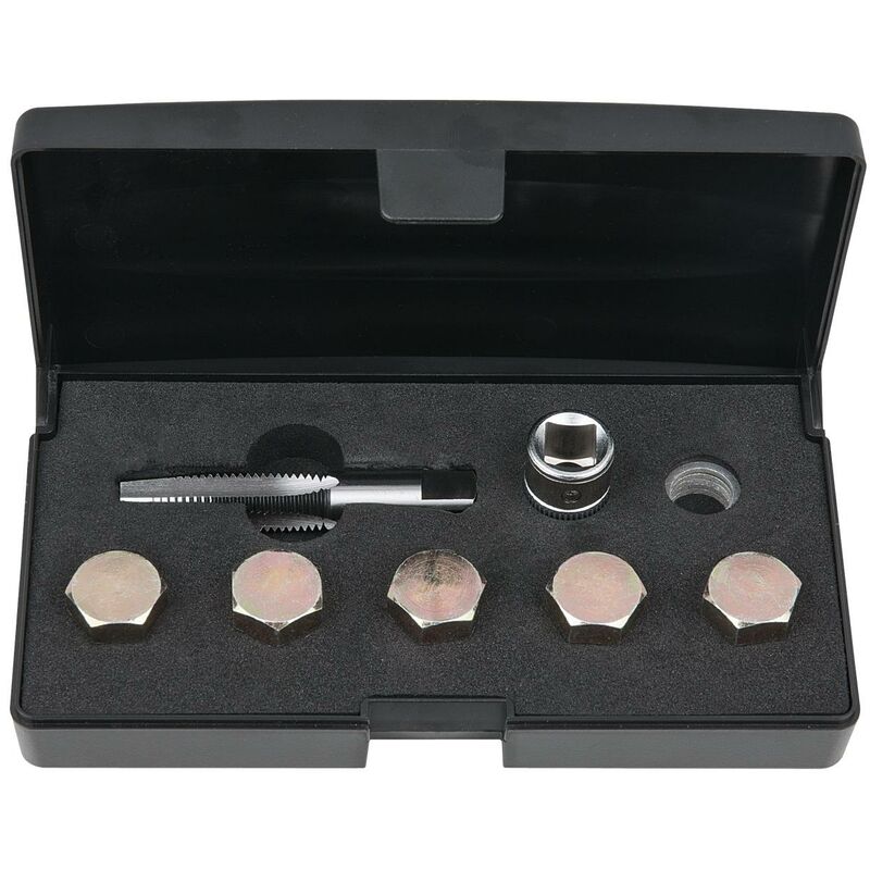 Per la riparazione sicura e rapida di filetti della vite di scarico olio Il filetto danneggiato viene intagliato con il maschio per filettare con una dimensione M12 x 1,5 Idoneo anche a coppe dell'olio in alluminio Consente la riparazione ed evita la sostituzione della coppa dell'olio Ideale anche per aperture di scarico più profonde Acciaio speciale per utensili In robusta valigetta di plastica Campo di applicazione: BMW, Citroën, Land Rover, Mazda, Peugeot, Volvo Pezzi in set 12 Peso del tessuto 280 Imballaggio Kunststoffkoffer, extra robust Dimensione della filettatura M12x1,5 Dimensioni dell'imballaggio 1