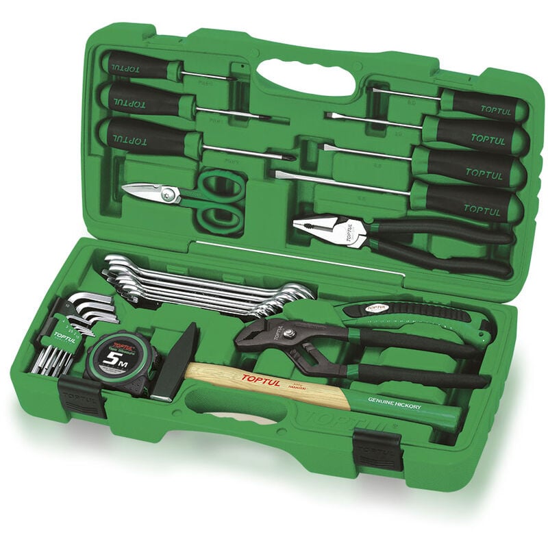 Valigetta completa di tensili per l'utilizzo casalingo. Chiavi fisse doppie 6x7 - 20x22. Serie di chiavi esagonali maschio. Pinza universale. Pinza poligrip. Martello 300g. Flessometro 5m. Cutter. Forbice elettricista. Cacciaviti a croce PH0 PH1 e PH2. Cacciaviti taglio 3 4 5.5 6.5 mm.