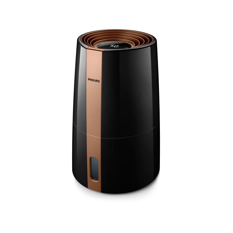 Respira facilmente e dormi in modo tranquillo Umidifica l'aria secca in modo igienico, giorno e notte L'umidificatore d'aria Philips serie 3000 aggiunge umidità negli ambienti secchi, in modo silenzioso e igienico, creando un'aria pura e sana in tutta la casa. La tecnologia di evaporazione NanoCloud diffonde il 99% di batteri in meno rispetto alla tecnologia a ultrasuoni* Tecnologia evaporazione Girante Capacità tanica acqua 3 L Sensore di umidità Sì Emissione acustica 33 dB Numero di velocità 3 Filtro estraibile Sì Indicatore del livello dell'acqua Sì Capacità di umidificazione 300 ml/h Tempo operativo 9 h Interrutore On/Off Sì Spegnimento automatico Sì Tipo di controllo Touch Rotelle No Igrometro Sì Spia Sì Filtro Sì Materiale della scocca Plastica Colore pannello di controllo Nero, Oro Numero di velocità della ventola 3 Superficie di efficacia 45 m² Display incorporato Sì Tipo di display LED Peso 2,61 kg Larghezza imballo 311 mm Profondità imballo 311 mm Altezza imballo 422 mm Peso