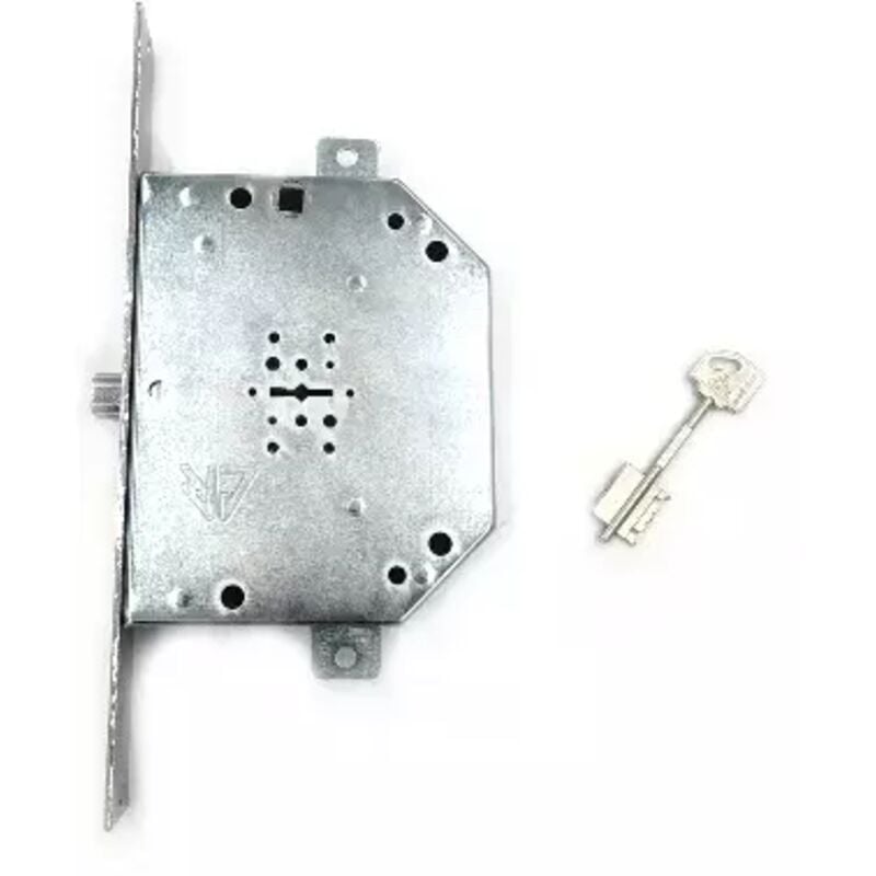 Serratura CR per porta blindata a doppia mappa infilare triplice 4 mandate con mezzo giro azionato da chiave e quadro maniglia versione destra. Dimensione scatola L.130 H.164 E.60. Interasse fissaggi 56x140x126. Versione con 4 catenacci piu' lo scrocco interasse mm.28.