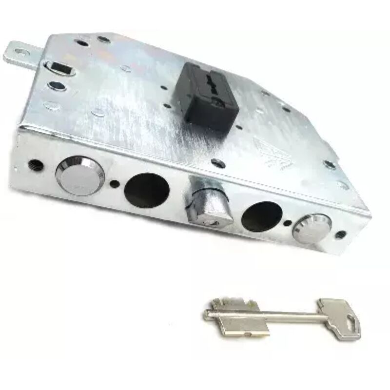Serratura CR per porta blindata a doppia mappa planare triplice 4 mandate con mezzo giro azionato da chiave e quadro maniglia versione destra. Dimensione scatola L.130 H.164 E.60. Interasse fissaggi 56x140x126. Versione con 2 catenacci piu' lo scrocco interasse mm.56 sporgenza mm.3,5.