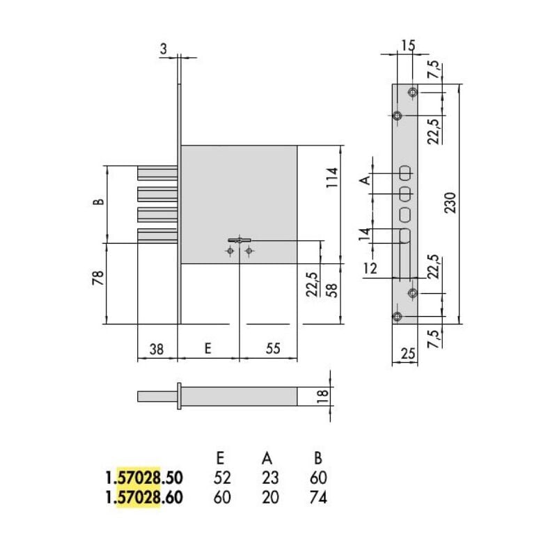 Serratura da infilare a doppia mappa con chiusura laterale. Altezza scatola mm.114 entrata mm.50. Completa di contropiastra.