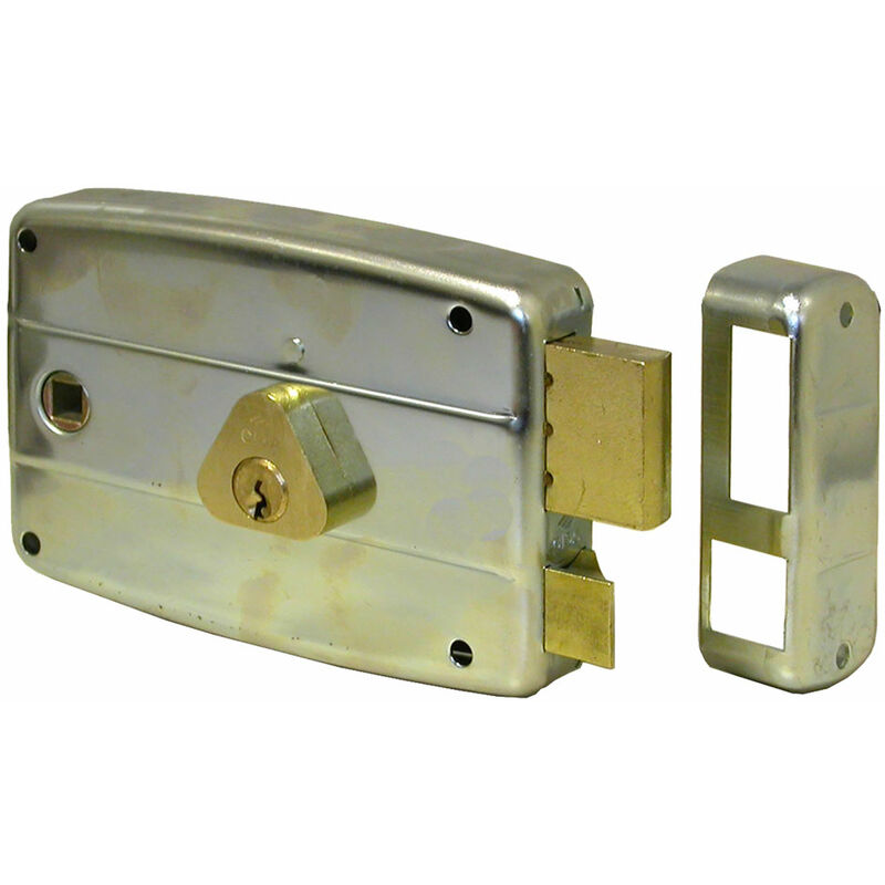 Cilindro esterno fisso. Catenaccio e scrocco separato in ottone, quadro maniglia passante mm 8. Scatola in acciaio con rivestimento in zinco. A 2 mandate. Dotata di bocchetta in acciaio zincato, viti fissaggio e 3 chiavi.