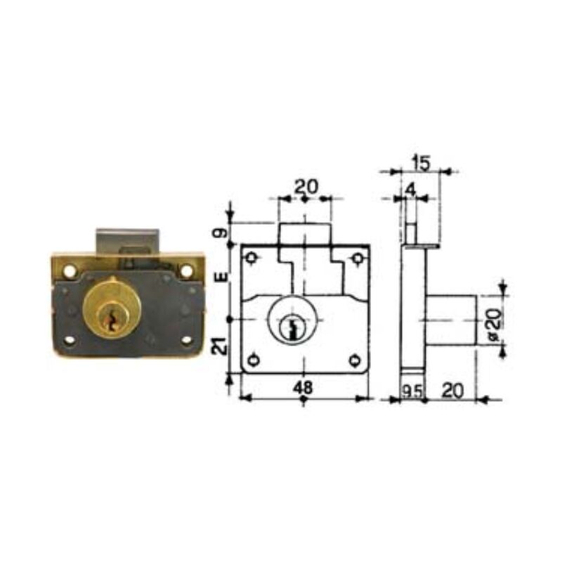 Mm.20 bordo in acciaio ottonato, cilindro in ottone ø mm.20, catenaccio in acciaio nichelato, dotazione 2 chiavi con impugnatura in metallo Categoria merceologica: Serrature per mobili e accessori - Sicurezza - Serrature per mobili