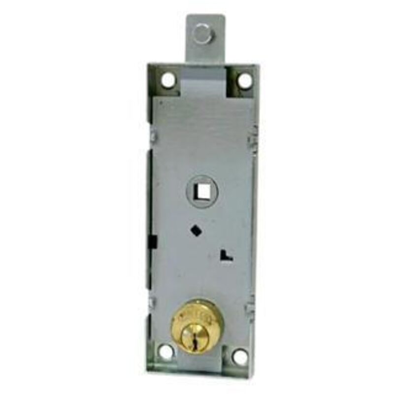 Cilindro in ottone. Catenaccio a 1 mandata. Interasse cilindro/maniglia mm.67. Azionamento del catenaccio con maniglia interna ed esterna, quadro maniglia mm.8. Apertura dall'interno mediante levetta. Scatola zincata mm.155x55.