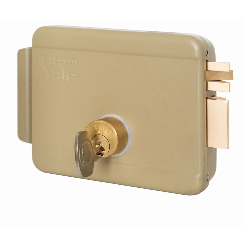 Serratura elettrica, prodotta dal brand Yale, da applicare per cancelli con cilindro esterno fisso a destra, entrata 50 mm. La serratura ha scroccoazionato dall'esterno e dall'interno mediante chiave o a distanza tramiteimpulso elettrico a basso voltaggio: 10W-12V. Dimensioni (L x P x A): 38 x130 x 106 mm.