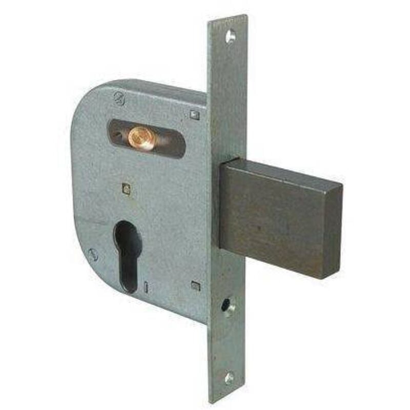 CISA SERRATURA CANCELLO INFILARE 42032 Bordo quadro zincato mm. 22 predisposto per cilindro sagomato + pomello entrata 50 mm CISA SERRATURA CANCELLO INFILARE 42032 Per cilindro sagomato. Scrocco reversibile con catenaccio incorporato. Chiusura a 1 mandata. Pomolo interno. Frontale in acciaio zincato con bordo quadro da Mm. 22x160. Altezza scatola Mm. 95. In dotazione: viti di fissaggio per cilindro.