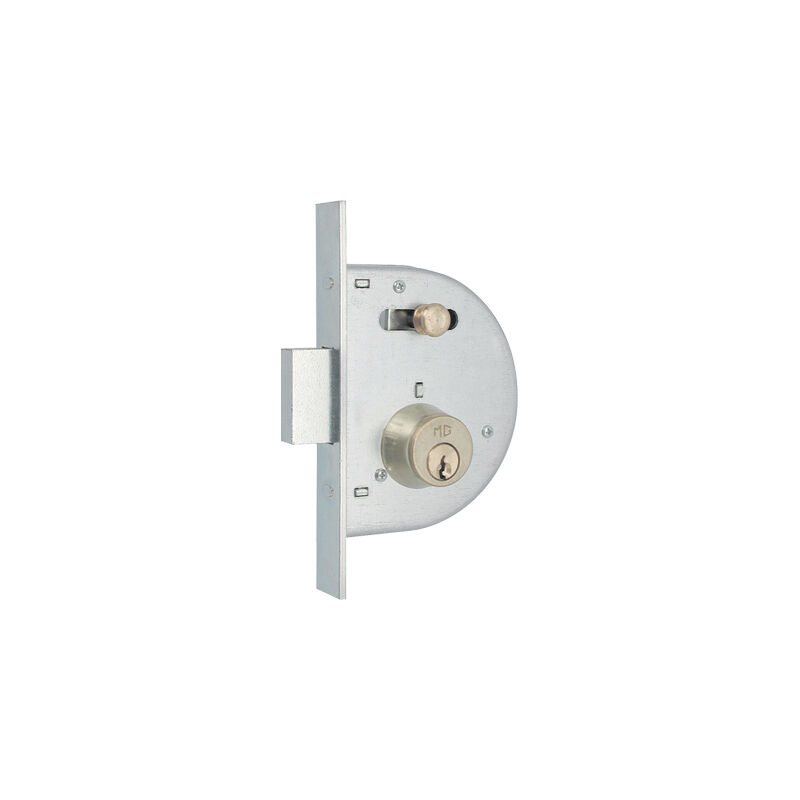 Con cilindro tondo da applicare da Mm. 25/33 di diametro. Scrocco ad 1 mandata con pomolino, catenaccio in acciaio. Scatola Mm. 82x103. Frontale a bordo quadro in acciaio zincato da Mm. 20x146. Entrata Mm. 35. Con 3 chiavi piatte in dotazione. In confezione da Pz. 2.