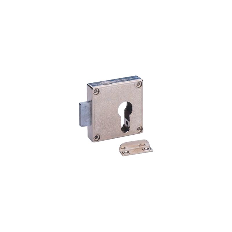 Dettagli: - serratura a cremonese per cilindro a 1/2 profilo - Cassa zincata nichelata, 60 x 60 mm, catenaccio da 40 mm - Serratura universale senza mano, da utilizzare con un cilindro da 1/2 con punta in asse - Fornita senza cilindro, con frontale e vite per cilindro da 30 mm