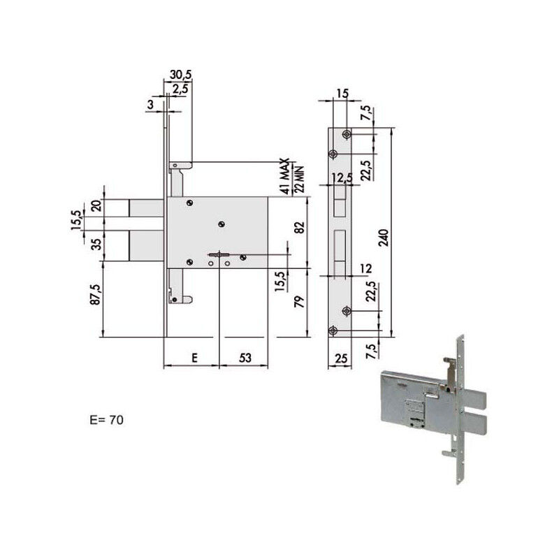 Serratura doppia mappa infilare alluminio Doppio catenaccio Ambidestra Predisposizione chiusure supplementari Scatola mm 82 - Frontale 25x240 2 chiavi