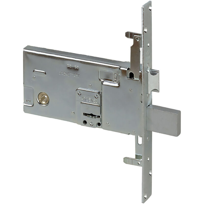 Triplice. Catenaccio e scrocco con rivestimento in zinco. Altezza scatola 82 mm, borchia in acciaio, 4 mandate, frontale 25 mm, interasse 67 mm, 2 chiavi.