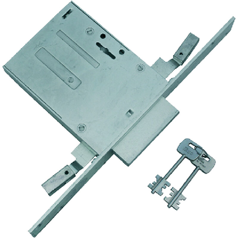 Triplice, quattro mandate. Dotata di due ghiere e due chiavi e raccordo per aggancio barre filettate M8 premontato.