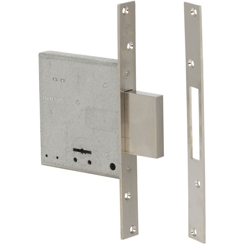 Scatola in acciaio con rivestimento in zinco, frontale e contropiastra in acciaio satinato nichelato. catenaccio acciaio nichelato. a 4 mandate, frontale 25 mm. dotazione viti fissaggio, 3 chiavi, contropiastra, copritoppa.e 60