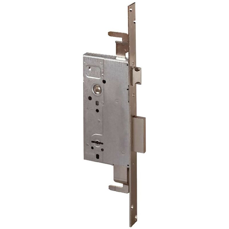 Triplice. catenaccio e scrocco, frontale e contropiastra in acciaio satinato, scatola acciaio. scrocco revesibile piatto ad invito nichelato, catenaccio 2 mandate. frontale 22 mm, interasse 85 mm. dotazione: contropiastra, viti, tre chiavi.e 60