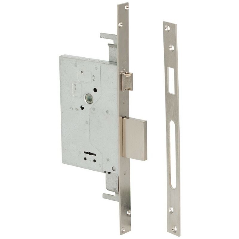 Triplice. catenaccio e scrocco, frontale e contropiastra in acciaio satinato, scatola acciaio. scrocco revesibile nichelato, catenaccio 4 mandate. frontale 22 mm, interasse 85 mm. dotazione: contropiastra, viti, tre chiavi.e 60