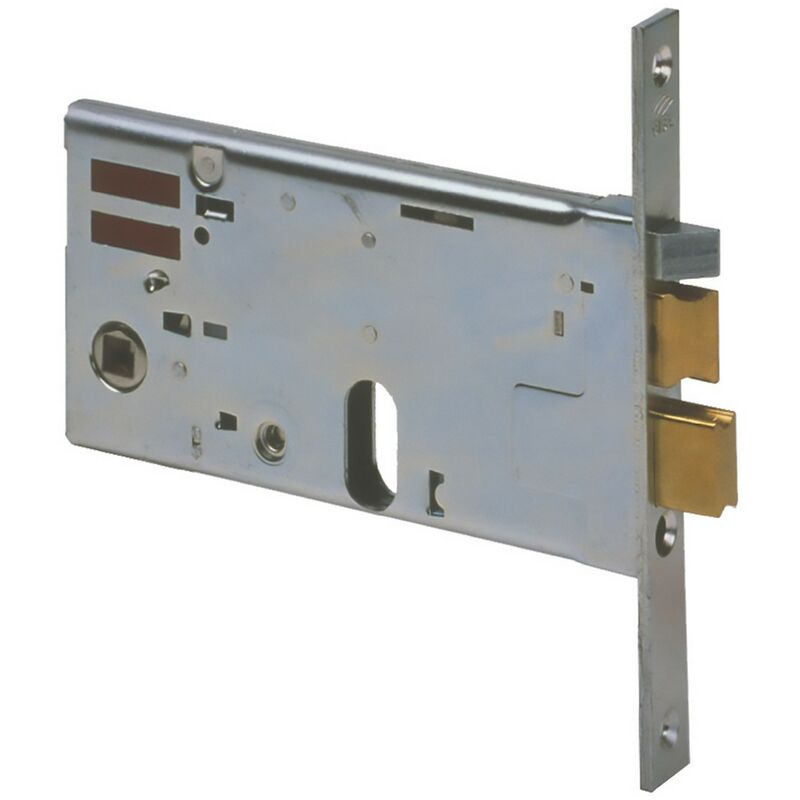 Foro cilindro europeo ovale. con scrocco autobloccante e catenaccio. scatola e frontale zincato. scrocco in ottone, altezza scatola 77 mm. tensione 12v, quadro maniglia mm 8, interasse 67 mm, 2 mandate. dotazione vite di fissaggio cilindro. senza cilindro