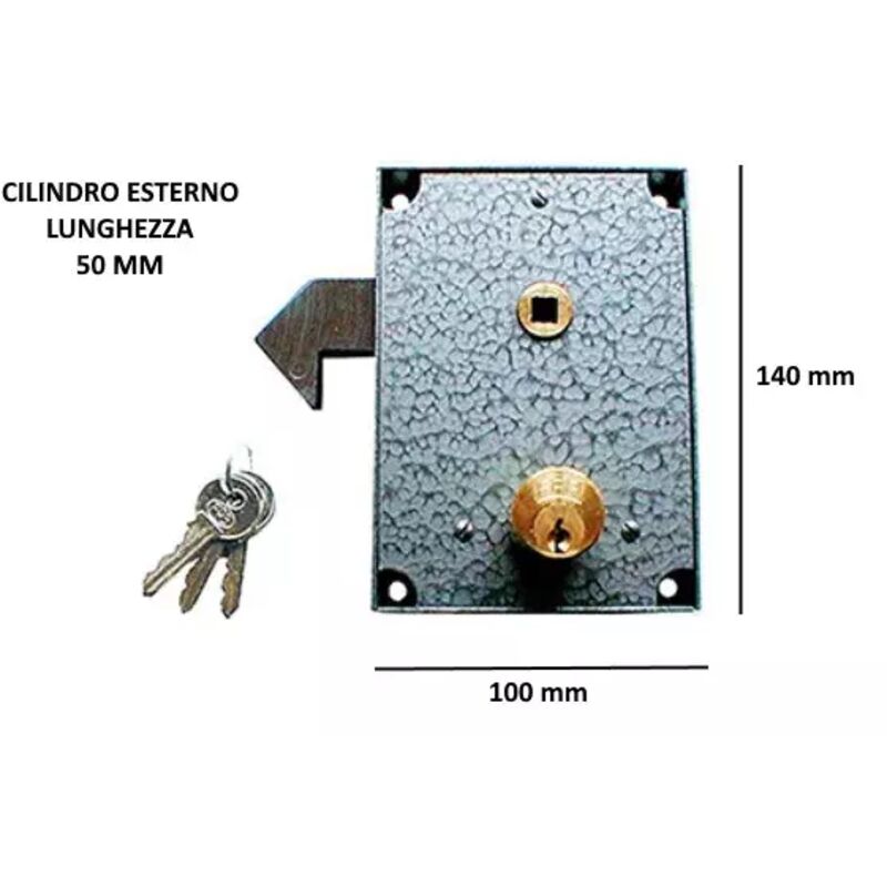 SERRATURA FANGAZIO MODELLO A GANCIO CILINDRO CORTO ART.50 FPB. Mano serratura destra. Serrature applicare per porte scorrevoli in ferro. Verniciate grigie. Il gancio è comandato dalla maniglia e bloccato dalla chiave. Cilindro d.mm.25, sporgenza lato esterno mm.50. Entrata mm.55. Scatola mm.100x140H. Interasse quadro-cilindro mm.65. Quadro mm.8. In dotazione 3 chiavi. La maniglia non è inclusa assieme alla serratura. NB: LA FOTO SI RIFERISCE ALLA MANO DESTRA.