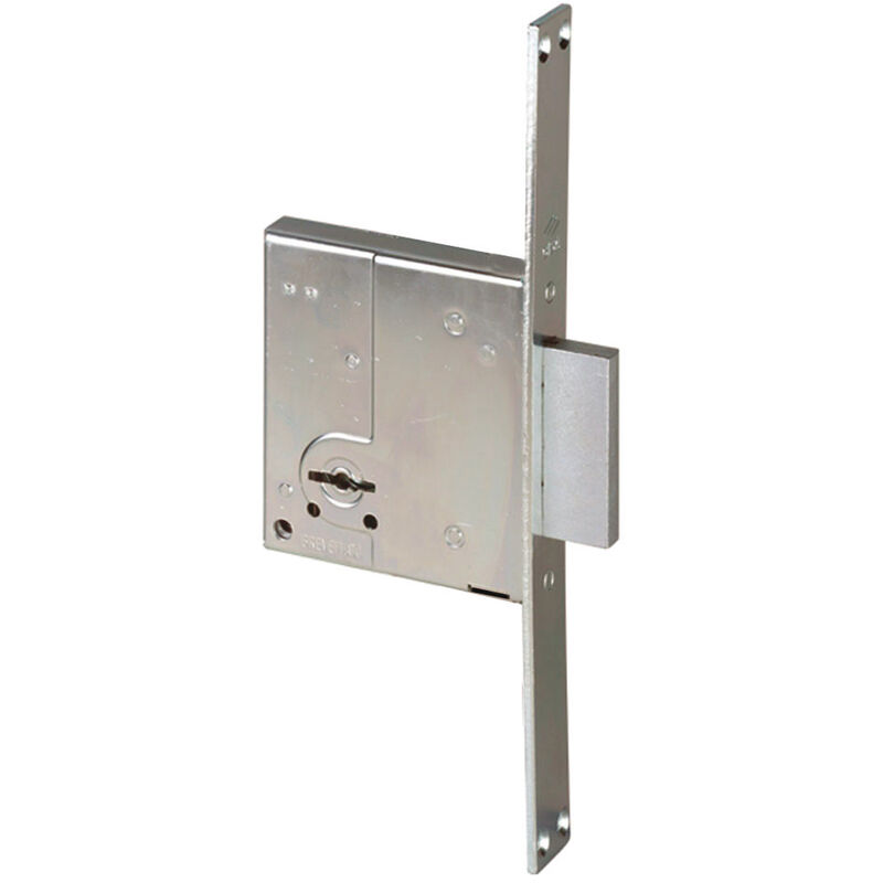 Serratura a doppia mappa da infilare. 2 mandate, copritoppa da saldare, 2 chiavi, zincata, scatole mm. 66/76x93.
