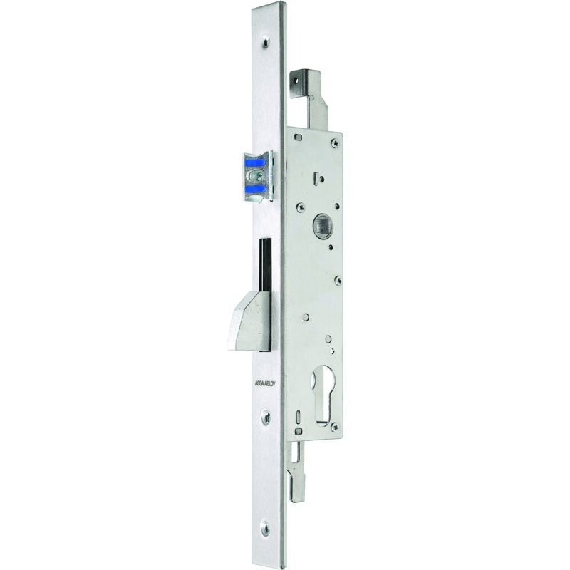 Assa abloy serratura ferro infilare montanti 3 punti chiusura art. d81 e.25 mm. Serratura da infilare per porte in ferro, inferriate o persiane di sicurezza. In acciaio zincato, Coprifrontali in accaio inox, scrocco e rullo intercambiabili e reversibili, sistema di confort sullo scrocco che permette di ridurre il rumore in fase di chiusura, limitare l?usura minimizzando gli attriti. Quadro maniglia, 2 rosette in acciaio zincato per cilindro, 2 boccole filettate (M8), tappo di copertura. Articolo produttore: D81325SCF25P851