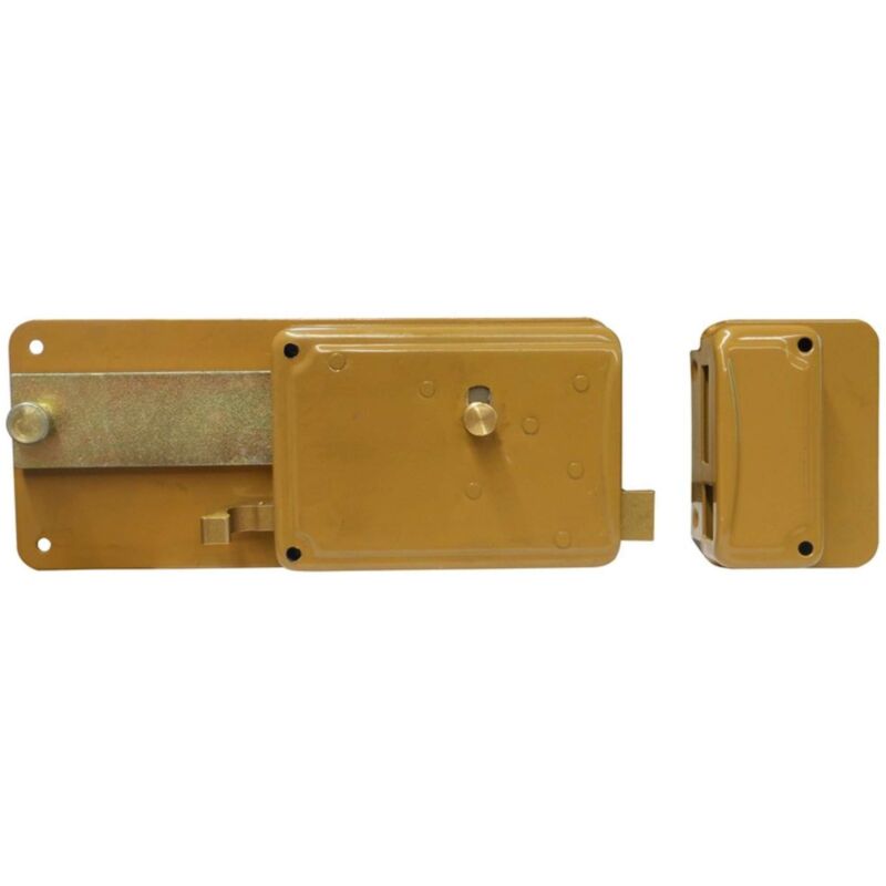 Cilindro staccato esterno e scrocco separato. Pomolo interno, cilindro a 5 pistoncini (2 antimanipolazione). Scatola a finitura verniciata elettrostaticamente con polvere epossidica color nocciola mm. 209x90. Completa di 3 chiavi in ottone nichelato, bocchetta, borchia e viti di fissaggio. In scatola.