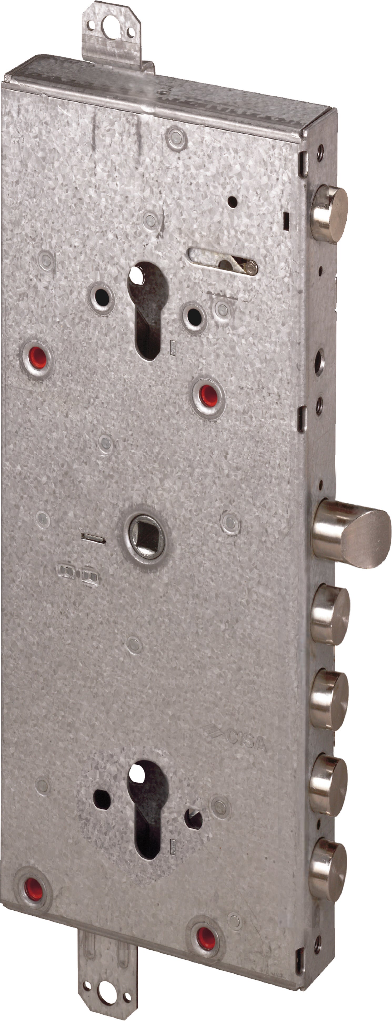 SERRATURA PLURIFUNZIONEPER PORTE BLINDATEcon serratura di servizioSerratura inferiorea cilindro - 2 mandateSerratura superiorea cilindro - 2 mandateLe due serrature azionano lo scrocco e sono indipendenti - E - 64 - Mano - Ambid