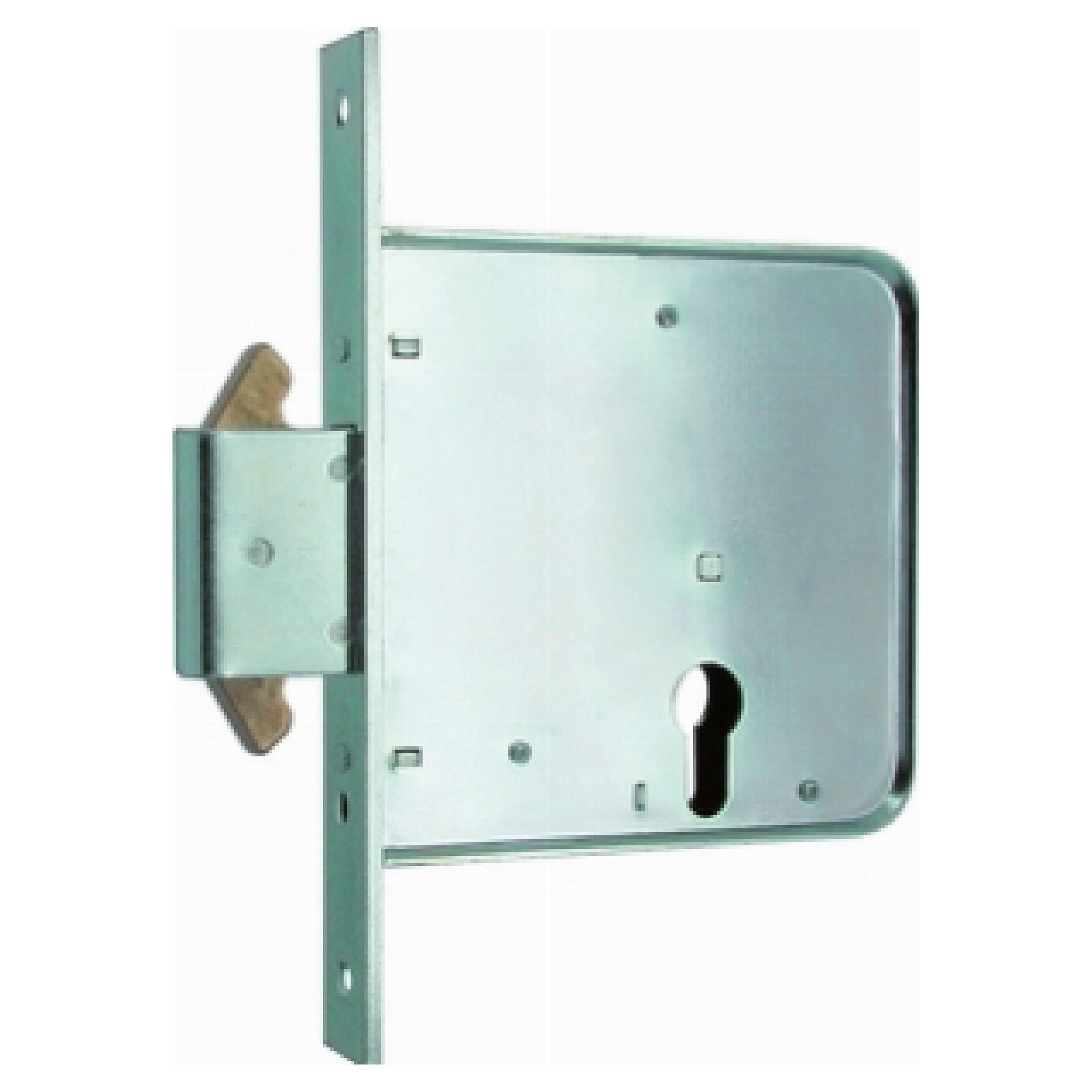 SERRATURA INFILARE gancio rientrante 3 mandate cilindro sagomato incluso - Tipologia - Infilare - Applicazione - Per cancello - Foro - Sagomato - Finitura - Zincato - E - 81 - Dim. cassa - 135 x 130 - Mano - Ambidestra - Frontale