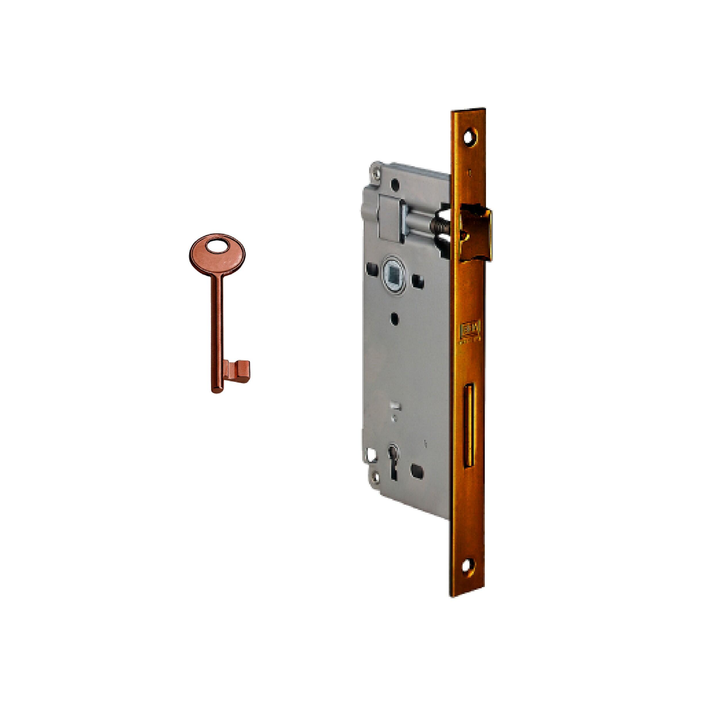SERRATURA PATENT GRANDEBordo quadrosenza incontroFront. 22 - E - 50 - Tipologia - Serratura Patent - Frontale - 22 X 238 - Bordo - Quadro - Int. man. - 90 - Chiusura - Scrocco più catenaccio - Finitura - Bronzata - Cassa