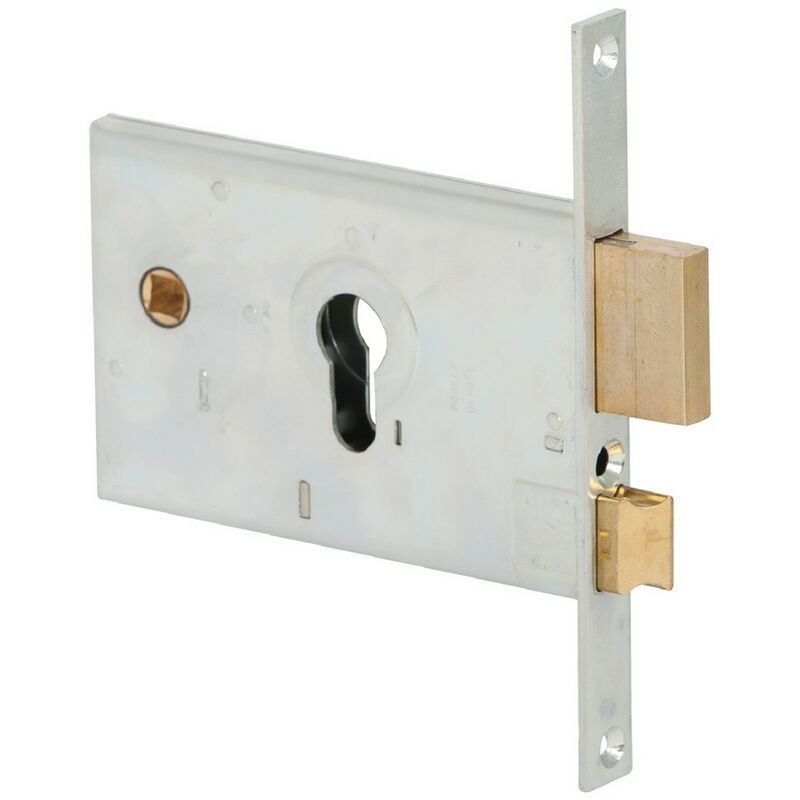Foro cilindro europeo. scatola e frontale zincato. scrocco in ottone, altezza scatola 82 mm. quadro maniglia mm 8, interasse 48 mm. dotazione vite di fissaggio cilindro. senza cilindro.e58 fr.20 mm - catenaccio + scrocco