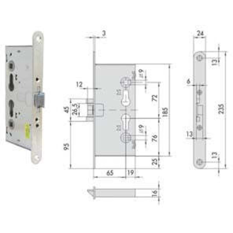 Ambidestra - interasse mm.72 - 1 mandata mm.15 - scatola in acciaio con rivestimento in zinco - scrocco in acciaio con rivestimento in zinco - frontale in acciaio con rivestimento in zinco - quadro maniglia sdoppiato mm.9 - frontale mm.24 - funzionamento interno con maniglione antipanico e/o chiave oppure funzionamento esterno dove la chiave richiama lo scrocco e il catenaccio, la maniglia richiama lo scrocco - abbinabili a maniglioni antipanico serie 59600 e 59710 - cilindro da ordinare a parte