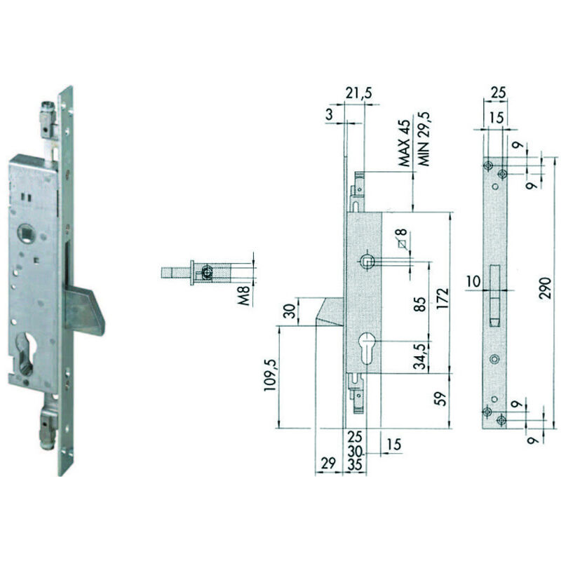 1 Mandata. Interasse mm 85. Frontale in acciaio inox mm 25. Corsa rinvii mm 25. Scatola in acciaio con rivestimento in zinco. Catenaccio nichelato. Quadro maniglia mm 8. Predisposizioni per chiusure supplementari con boccole filettate M8. Cilindro non incluso.