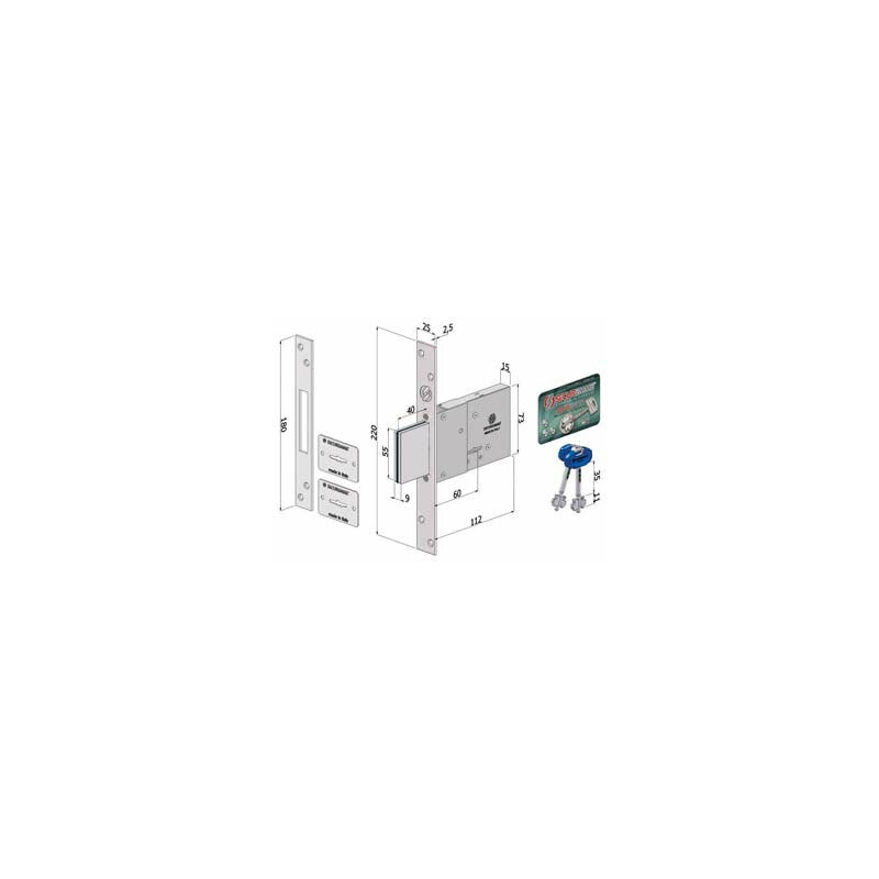 Mm.60 (2001XZB6025A32) scatola frontale contropiastra e copritoppa in acciaio zincato catenaccio movimentato da chiave brevetti contro la manipolazione serratura con chiave doppia mappa SECURMAP11 brevettata a duplicazione protetta in dotazione: 1 contropiastra CP2001XZB, 2 piastrine 4901XZB, 2 chiavi e 1 security card. Pezzi per confezione primaria: 1,0 Larghezza 24,4 Lunghezza 13,3 Altezza 4,4 Peso 0,742