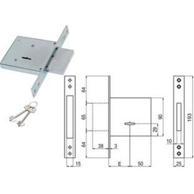 Scatola e coperchio in acciaio zincato - piastra frontale e contropiastra nichelate - catenaccio cromato - 4 mandate - in dotazione: contropiastra in acciaio nichelato, viti di montaggio, 2 chiavi cifrate, bocchette copritoppa in ottone