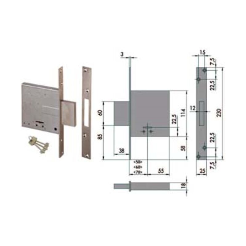 Mm.60 (57010600) scatola in acciaio con rivestimento in zinco, frontale e contropiastra in acciaio satinato nichelato, catenaccio in acciaio nichelato, 4 mandate, solo catenaccio, dotazione contropiastra, copritoppa interna ed esterna in ottone, 3 chiavi Categoria merceologica: Serrature, chiusure di sicurezza e accessori - Sicurezza - Serrature a doppia mappa da infilare