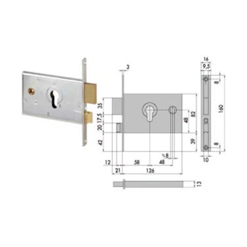 Mm.60 (44120600) scatola e frontale in acciaio con rivestimento in zinco, catenaccio a 2 mandate e scrocco reversibile separato in ottone, con quadro maniglia da mm.8 passante, funzionante con cilindro sagomato non compreso, scatola mm.82h. Categoria merceologica: Serrature, chiusure di sicurezza e accessori - Sicurezza - Serrature per fasce da infilare