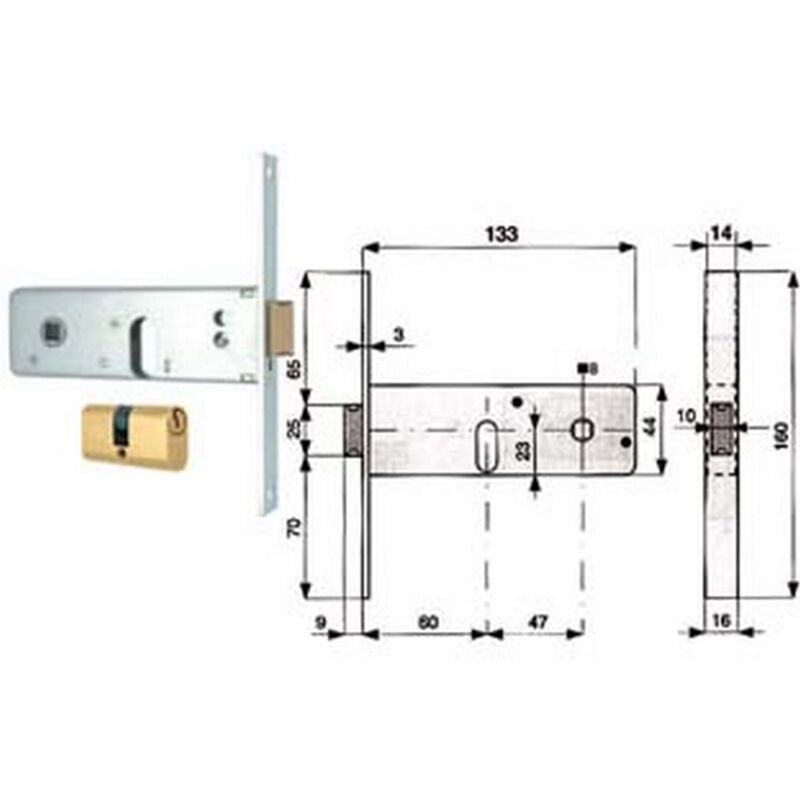 In acciaio zincato, con scatola e frontale da mm.16, catenaccio a 2 mandate con scrocco incorporato in ottone con richiamo tramite chiave o quadro maniglia da mm.8 passante, con cilindro ovale da mm.56 centrato (28x28), scatola mm.44h.