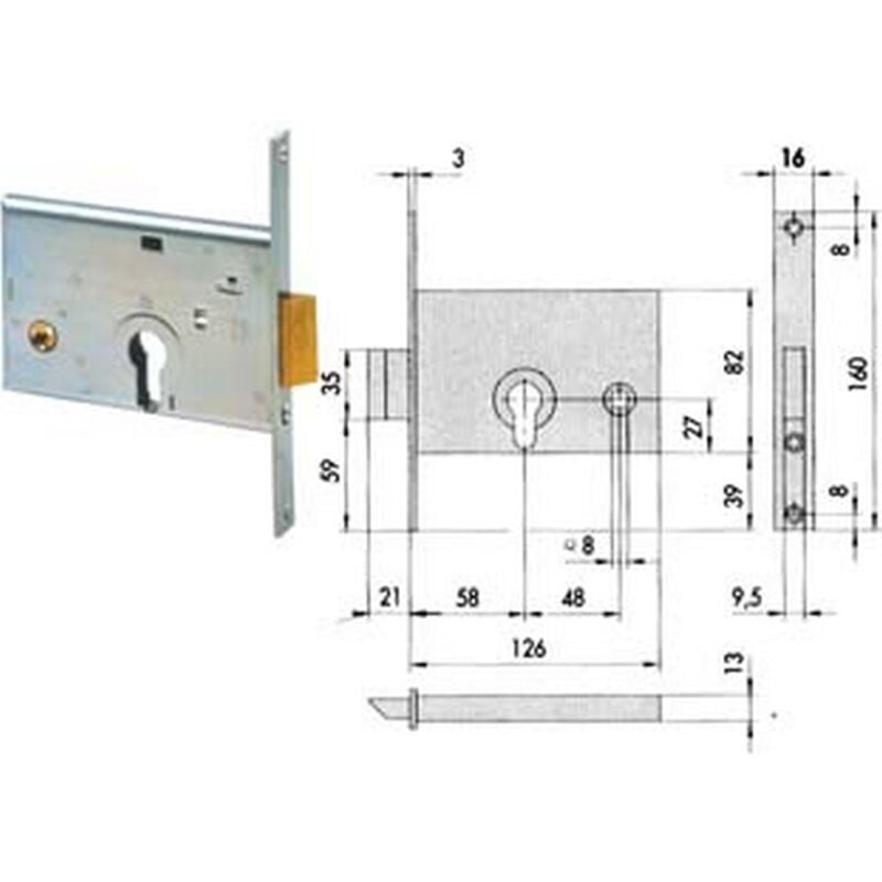 Scatola e frontale in acciaio con rivestimento in zinco, catenaccio con scrocco incorporato reversibile in ottone, fermo a giorno, con quadro maniglia da mm.8 passante, funzionante con cilindro sagomato non compreso, scatola mm.82h.