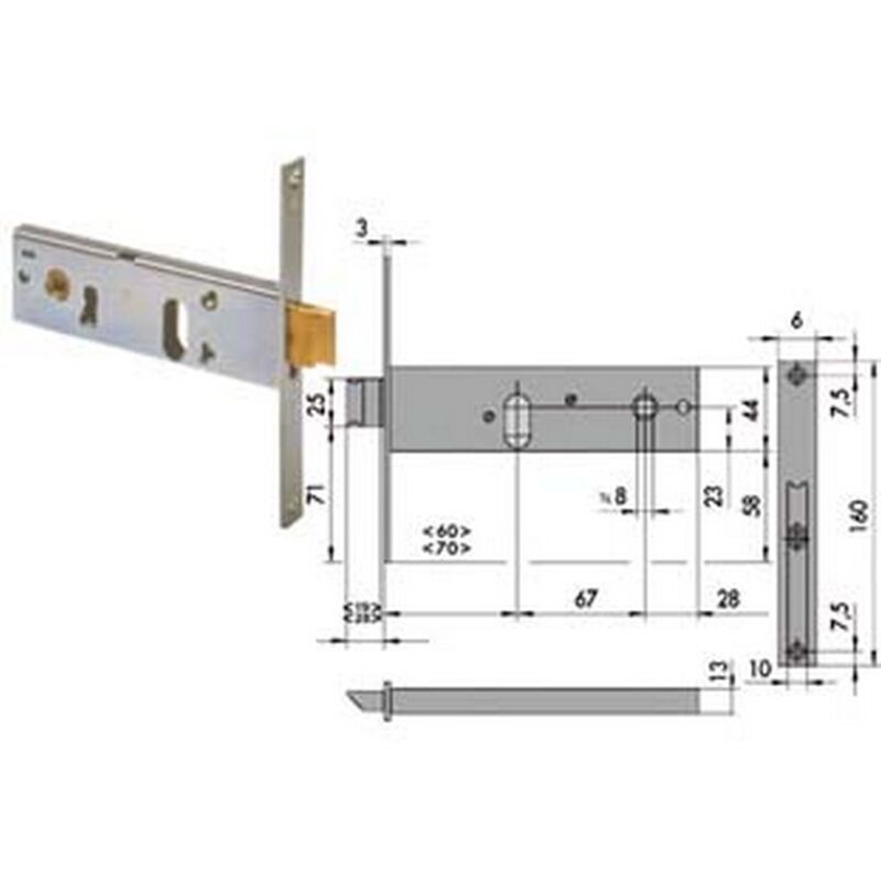 Scatola e frontale in acciaio con rivestimento in zinco, catenaccio con scrocco incorporato in ottone, con quadro maniglia da mm.8 passante, funzionante con cilindro ovale non compreso, scatola mm.44h.