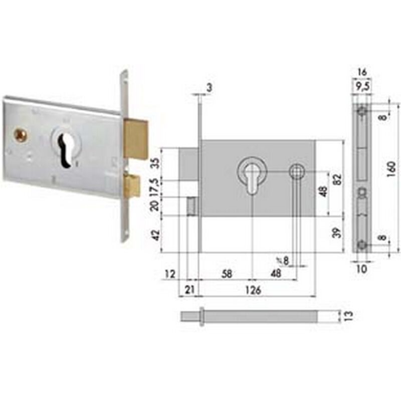 Scatola e frontale in acciaio con rivestimento in zinco, catenaccio a 2 mandate e scrocco reversibile separato in ottone, con quadro maniglia da mm.8 passante, funzionante con cilindro sagomato non compreso, scatola mm.82h.