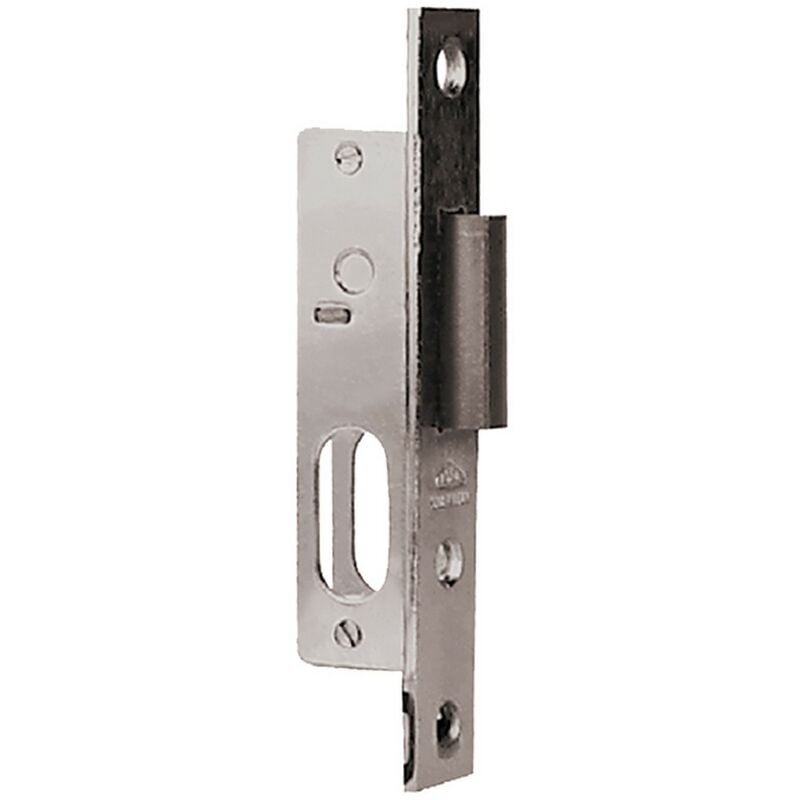 Una mandata, catenaccio a filo frontale. dotata di cilindro, vite fissaggio cilindro, tre chiavi. frontale in acciaio cromato.e 15 - fr. mm 16