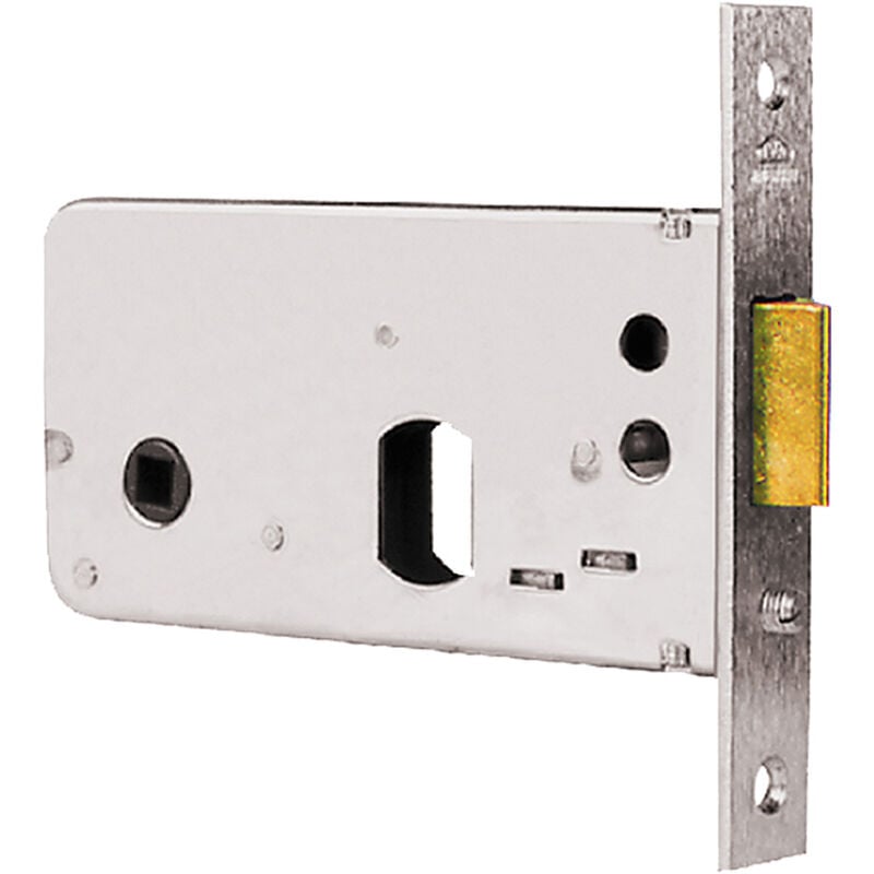 Una mandata a scrocco. Quadro maniglia mm 8. Dotata di cilindro, vite fissaggio cilindro, due ghiere.