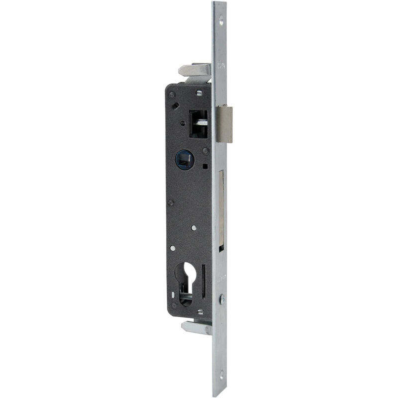 Una mandata, scrocco reversibile, chiusura triplice. Frontale zincato. Senza cilindro. Completa di due raccordi filettati M8.