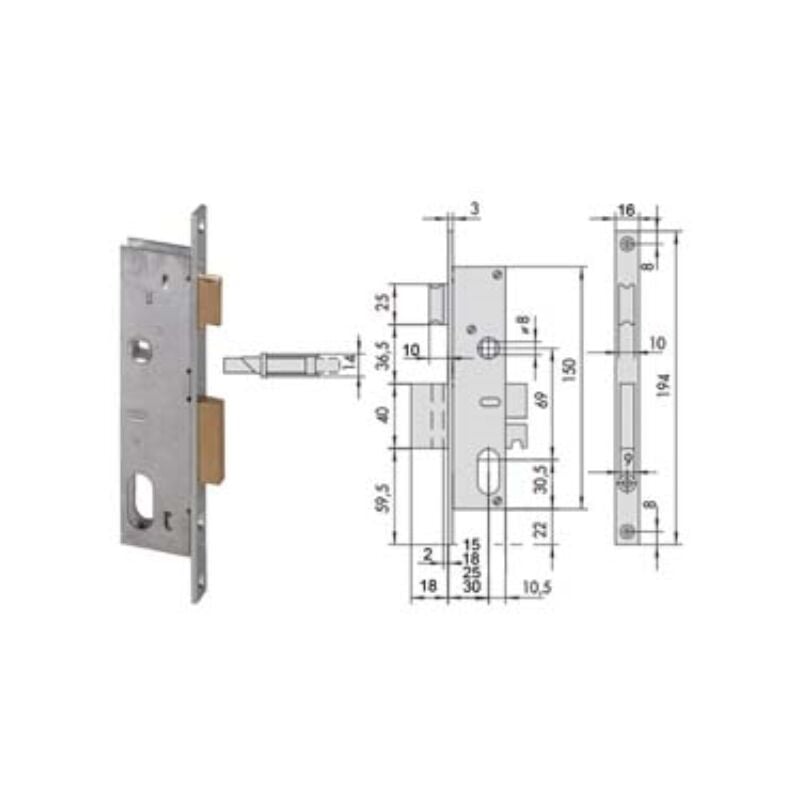 Mm.25 (44225250) scatola e frontale in acciaio con rivestimento in zinco, catenaccio e scrocco in ottone reversibile, 2 mandate, quadro maniglia, cilindro ovale non compreso Categoria merceologica: Serrature, chiusure di sicurezza e accessori - Sicurezza - Serrature per montanti da infilare