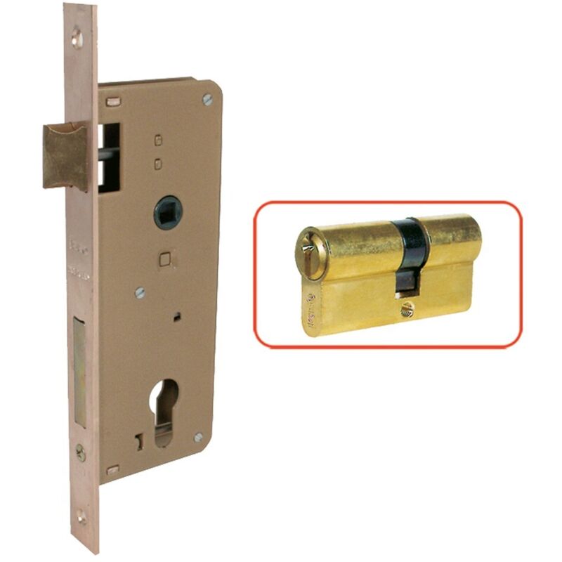 E 60 Scrocco e catenaccio a due mandate. Frontale in acciaio ottonato. Bordo quadro. Scrocco reversibile, quadro maniglia mm 8. Completa di cilindro mm 61. Contropiastra da ordinare a parte.