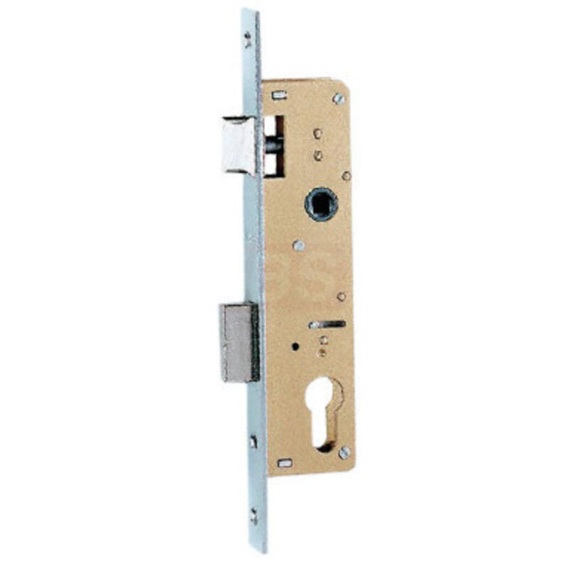 Per montanti di profilati metallici, a 1 mandata, con scrocco e catenaccio prolungati quadro maniglia, testata 22 mm., entrata 20 mm.;