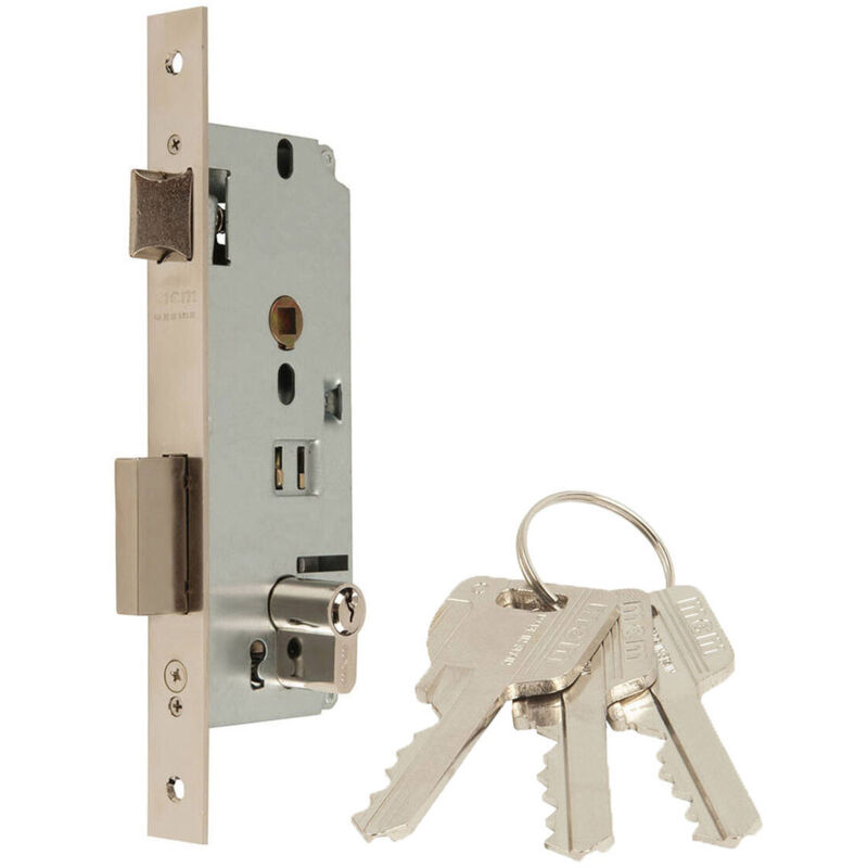 Serratura da infilare a 1 punto per porte larghe 85 mm, finitura nichel. Include 3 chiavi seghettate. Serratura da infilare a 1 punto Porte larghe 85 mm Finitura nichel Include 3 chiavi serreta