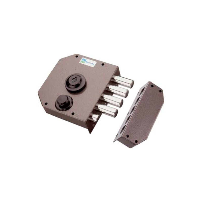 Con cilindro a pompa esterno Mm. 50 e calotta chiave interna. Scrocco. Chiusura con catenaccio a 4 pistoni e 4 mandate, corsa Mm. 40. Scatola Mm. 132x146. In acciaio verniciato. In dotazione: 3 chiavi, 1 mostrina, 1 ferrogliera e viti per il montaggio.