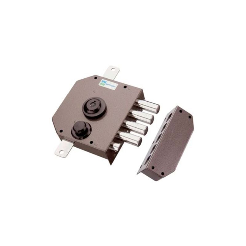 Con cilindro a pompa esterno Mm. 50 e calotta chiave interna. Scrocco. Chiusura triplice con catenaccio a 4 pistoni e 4 mandate con mezzo giro, corsa Mm. 40, e predisposizione per fissaggio aste, corsa Mm. 17. Scatola Mm. 132x146. In acciaio verniciato. In dotazione: 3 chiavi, 1 mostrina, 1 ferrogliera, 2 passanti aste, 1 cavallotto, 1 bocchetta a pavimento e viti per il montaggio.
